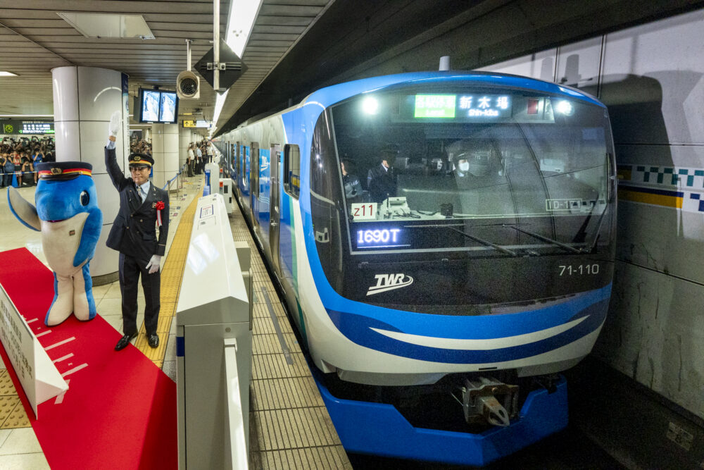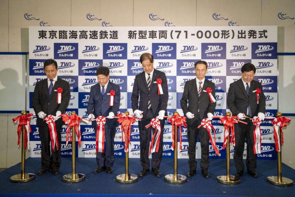このイベントは、りんかい線開業以来初めて導入される新型車両「71-000形」の営業運転開始を記念して実施されました。出発式では、駅コンコースで社長挨拶、新型車両の概要説明、テープカットが行われ、その後ホームで「71-000形」の初運行を見守る出発の瞬間を祝いました。