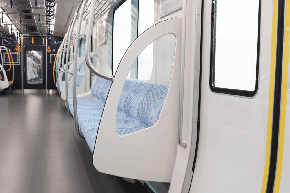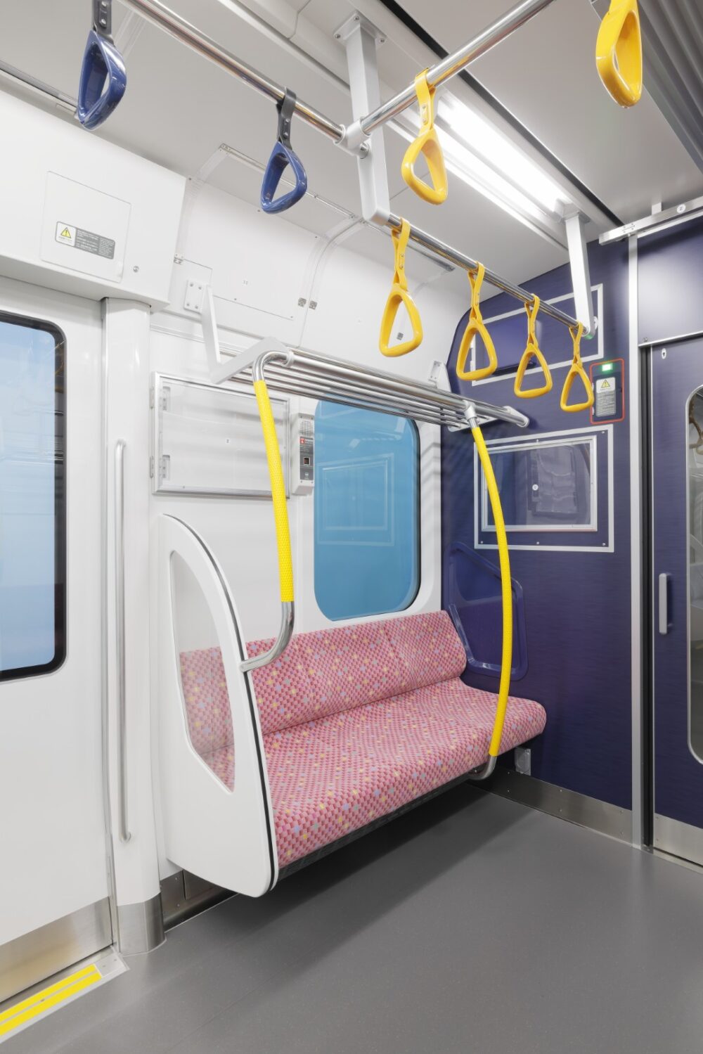 - 座席は、グレーとブルーを基調としたブロック柄とし、都会的でクールな雰囲気を表現しています。また、優先席はピンクを基調とした色とし、落ち着いた印象を持たせています。