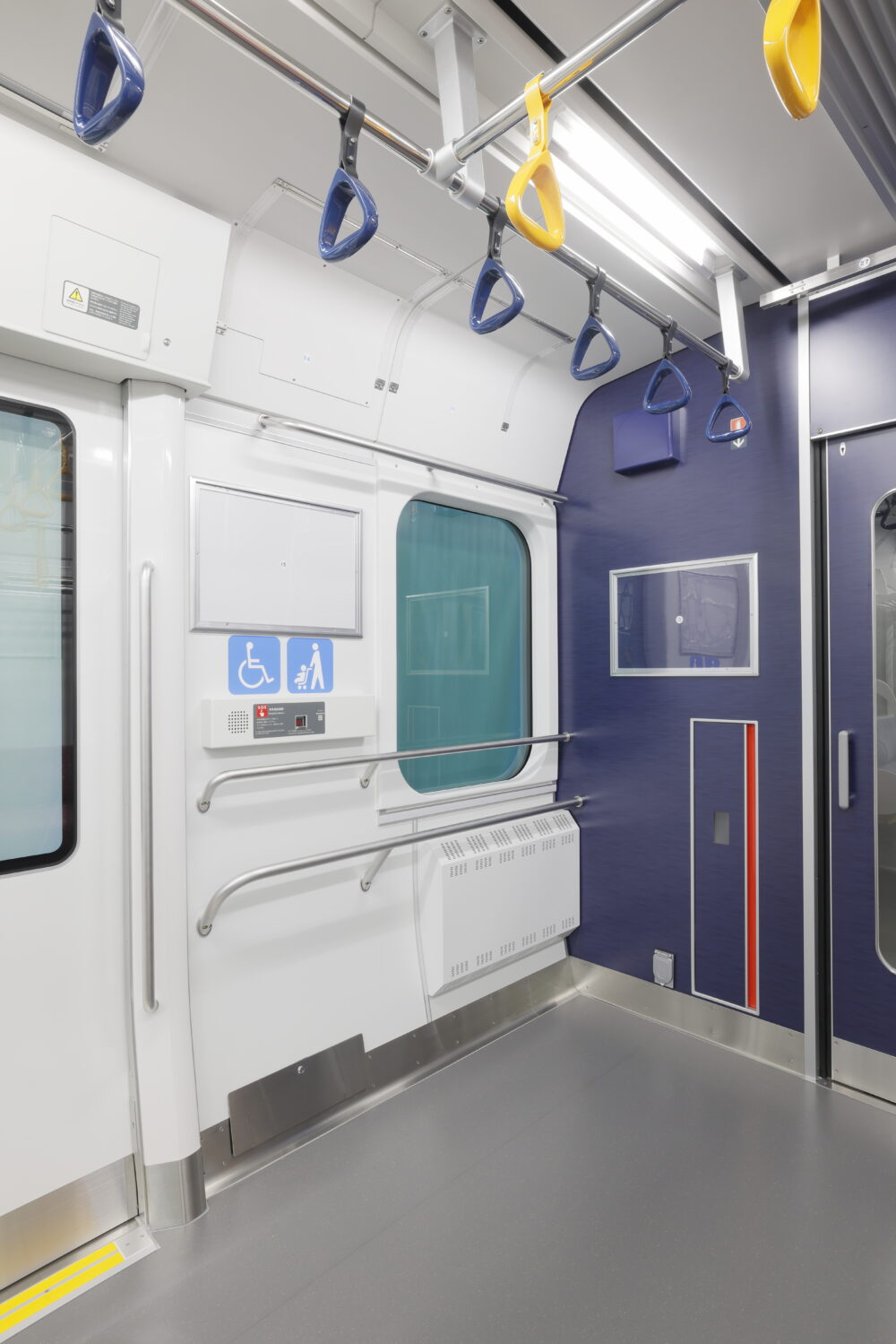 車両床面はホームから50mm下げられ、段差が少なくなりました。全車両にフリースペースを設置し、車いすやベビーカーをご利用のお客様の利便性が向上しています。ドアの開閉時にはチャイムと表示灯の点滅で知らせ、開いているドアの位置は誘導鈴で聴覚的にも案内されます。荷棚や吊り手も低く設定され、より多くのお客様にとって使いやすい高さになりました。