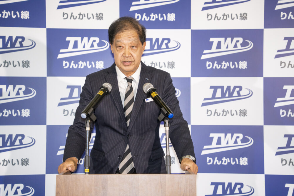 MCによる紹介の後、東京臨海高速鉄道の西倉鉄也代表取締役社長が登壇し、挨拶を行いました。