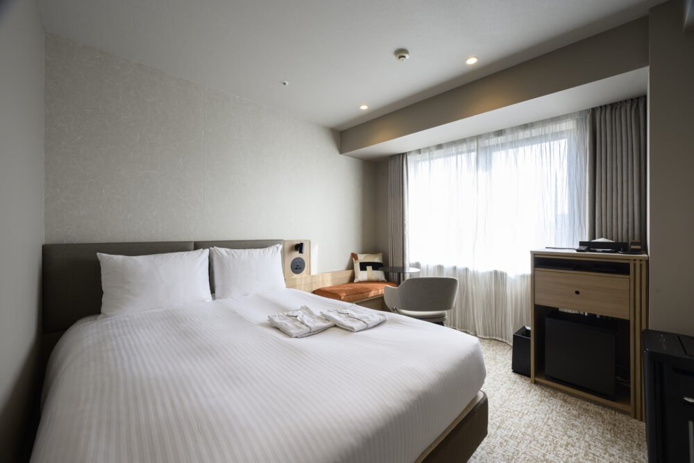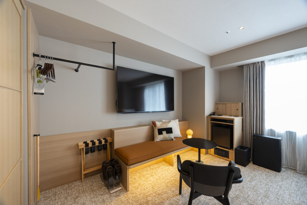 デスクの代わりにワイドベンチとサイドテーブルを組み合わせたレイアウトを採用し、ベンチ下を収納として活用することで、床面にゆとりが生まれ、客室全体がより開放的な印象となるようデザインされた、快適性を重視したスタンダードな客室です。