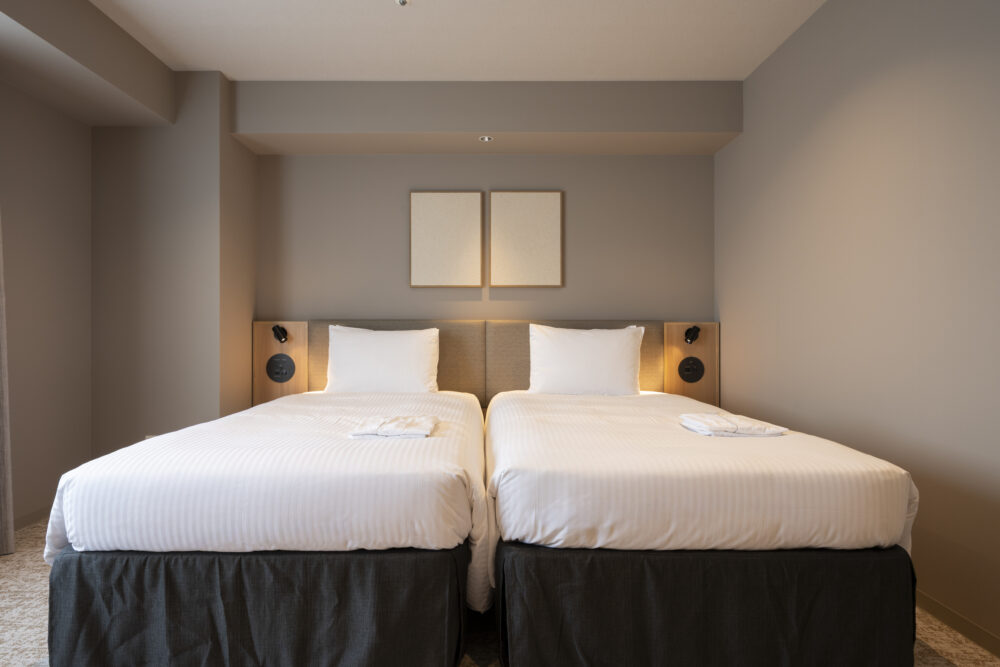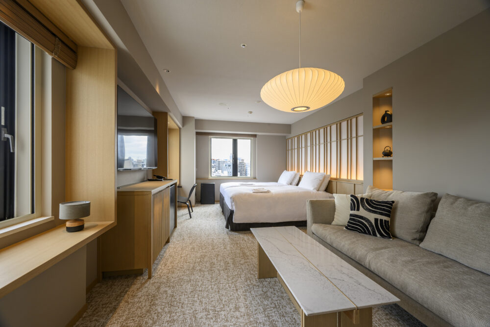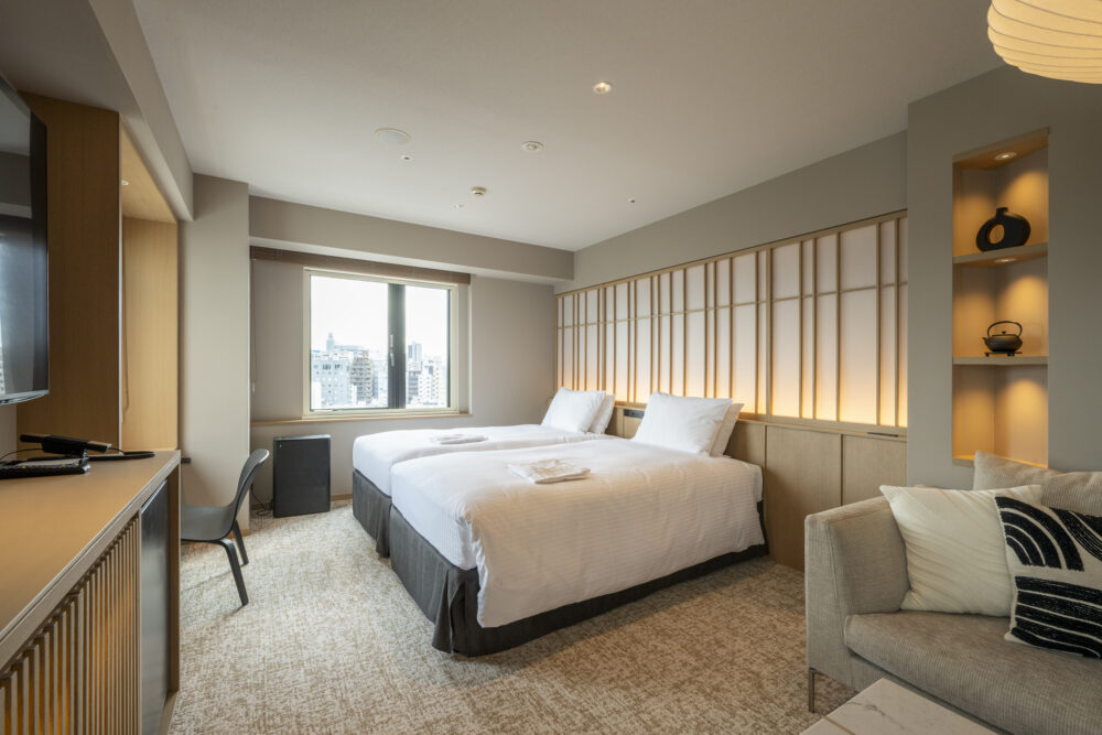 リッチモンドホテル浅草では、新たに、ダブルルーム2室を連結し、広々としたツインルームを設けました。デザインの基調は、北欧のミニマルな美意識と日本の静謐な雰囲気を融合させた「ジャパンディ」スタイルです。