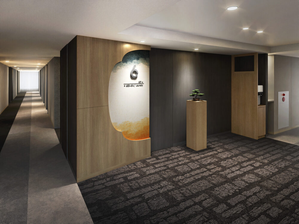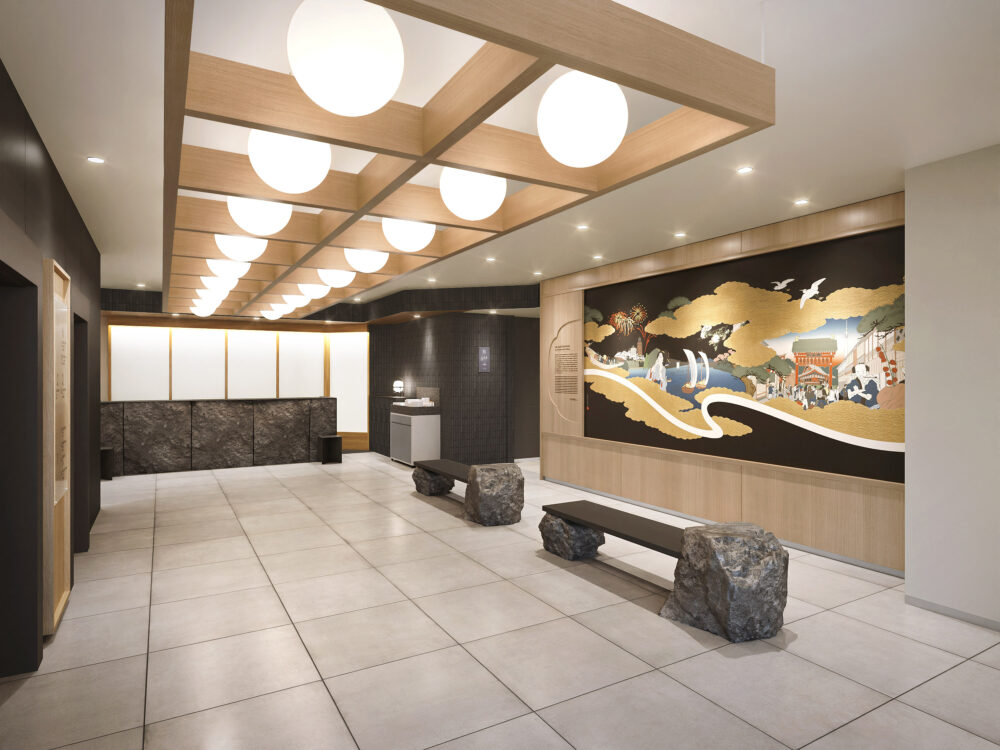 ロビー(1階)では、浅草の灯り文化を象徴する提灯格子や一文字ぼかしのアートワークを配置し、素材には浅草寺にも使用される小松石や黒皮風仕上げを採用することで、「静寂と陰影の美」を感じる上質な空間を演出します。アプローチでは、エレベーターホールに石畳を想起させるカーペットを敷き、参道をイメージすることで、客室までの動線全体で浅草の伝統と現代性が調和した世界観を表現しています。