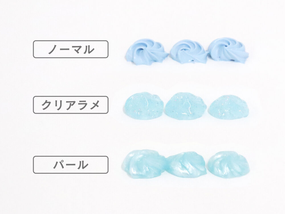 仕上がりの雰囲気は自由自在で、ラメ入りで華やかなクリアタイプ、上品な光沢で写真映えするパールタイプ、扱いやすさと発色の良さが魅力の通常カラーから選べます。