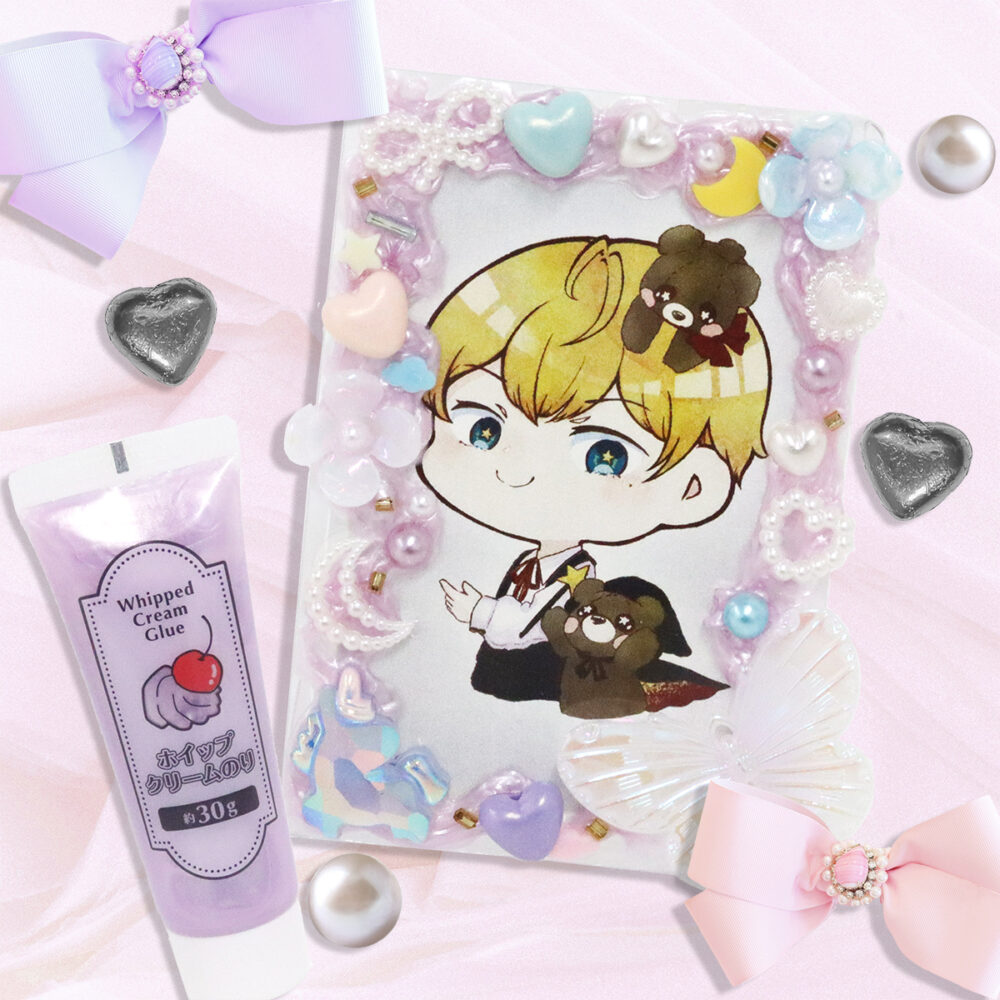 使い方は簡単で、土台となるカードケースなどにホイップクリームのりを絞り出し、リボンやビーズ、かわいい樹脂パーツをトッピングするだけで、自分だけの “推しデコ” アイテムがすぐに完成します。他社製品と比較しても、高い透明感と光沢感が魅力で、写真映えする高品質な仕上がりにこだわったとのこと。