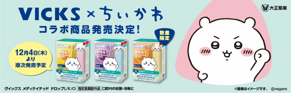 大正製薬株式会社は、人気のキャラクター「ちいかわ」とコラボレーションしたオリジナル企画品「ヴイックス メディケイテッド ドロップ」を、2025年12月4日(木)より数量限定で順次発売しています。