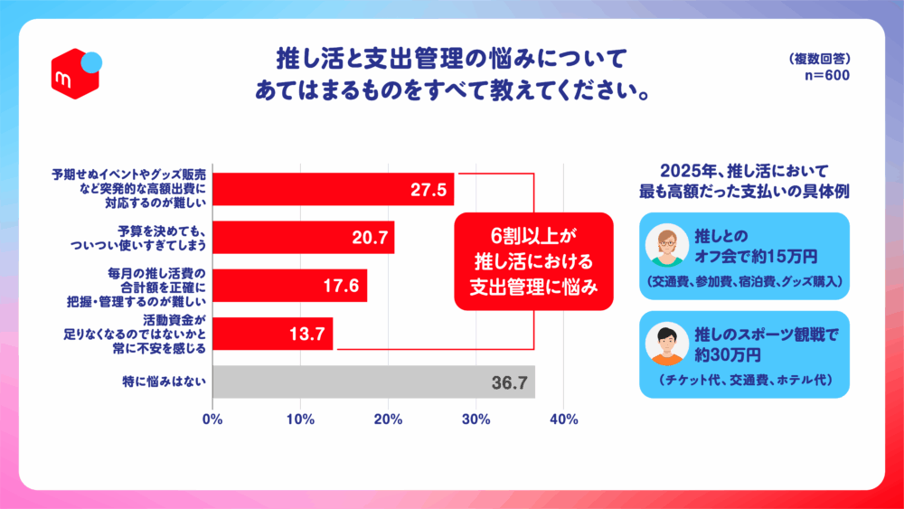 一方で、推し活における支出管理に悩む人は6割以上(63.3%)に上り、その最大の要因は「予期せぬイベントやグッズ販売など、突発的な高額出費への対応の難しさ(27.5%)」であることが分かりました。