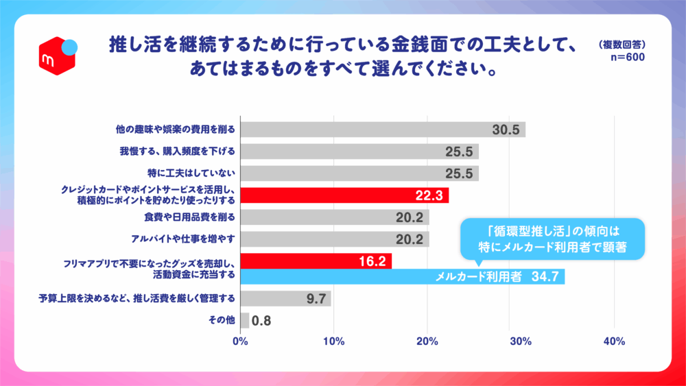 特に「メルカード」利用者において、この「循環型推し活」の傾向は顕著です。本調査のメルカード利用者で、推し活の資金繰りにフリマアプリを活用する人は34.7%に達し、全体の約2倍の割合となりました。この結果は、「メルカリ」の売上金(メルペイ残高)を支払いに直接充当できる「メルカード」が、「循環型推し活」と高い親和性を持ち、利用者が「推し」活動をよりお得に楽しむ消費スタイルを強く後押ししていることを示唆しています。
