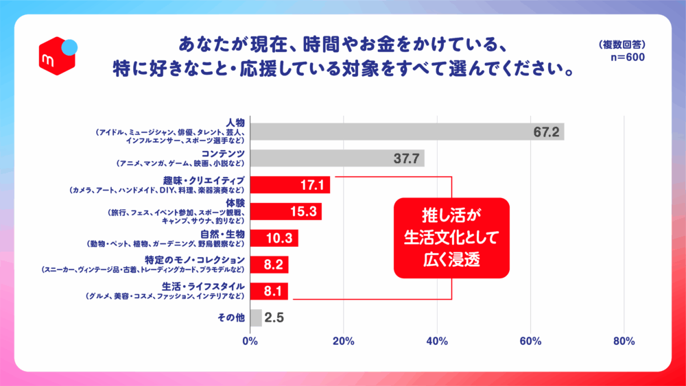 株式会社メルペイは、全国の18歳〜69歳の男女4,707名の中から「推し活を行っている」と回答した600名を抽出し、「推し活と金銭感覚・消費行動」に関する調査を実施しました。