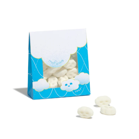 “もふふわ食感” のマシュマロ「mofuwa」が、一口サイズにプチっと小さくなった「mofuwa プチ」。フレーバーは爽やかなヨーグルトソーダ味。パッケージの窓からは雲の形のなんともいえない癒し系の表情がのぞきます。