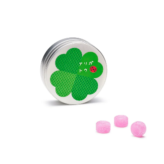 アリガトウのメッセージ付きで感謝の気持ちを伝えるのにぴったりな小さな缶のパッケージです。味はグレープ味。