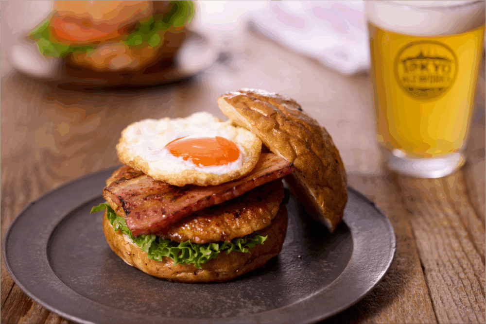 自家醸造で生まれる廃麦を生地に練り込んだ、香ばしいバンズを使用。規格外の完熟柿を使ったジャムを隠し味に加え、あまじょっぱい味わいに仕上げたバーガーです。かたい肉質で使われにくかった親鶏は、細かくミンチにして食感を整え、照り焼きソースとロスパンで育った卵のトッピングを合わせることで、親鶏ならではの旨味とコクを引き出しました。