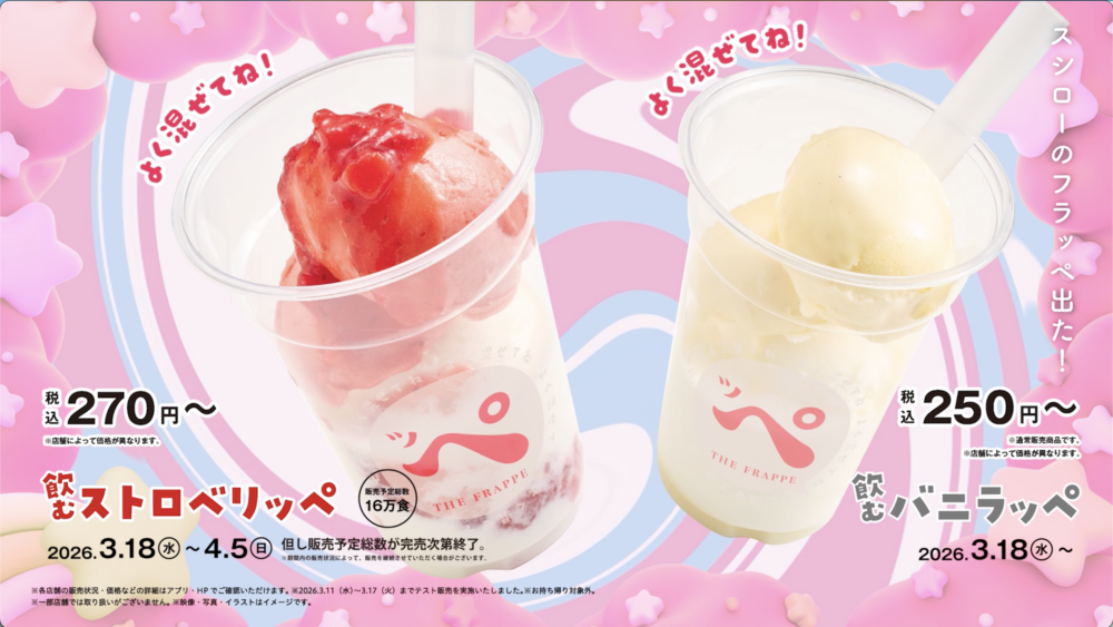 株式会社あきんどスシローの “SUSHIRO Cafe” から、混ぜて楽しむ新しいひんやりスイーツ「フラッペ」が提案!その第一弾として、「飲むストロベリッぺ」と「飲むバニラッぺ」が、2026年3月18日(水)より全国のスシローで発売されました。